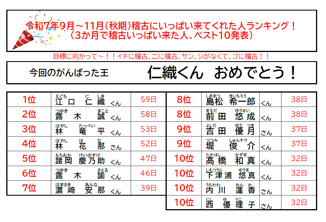 > 2025年秋期(9月~11月)空手出席日数報告