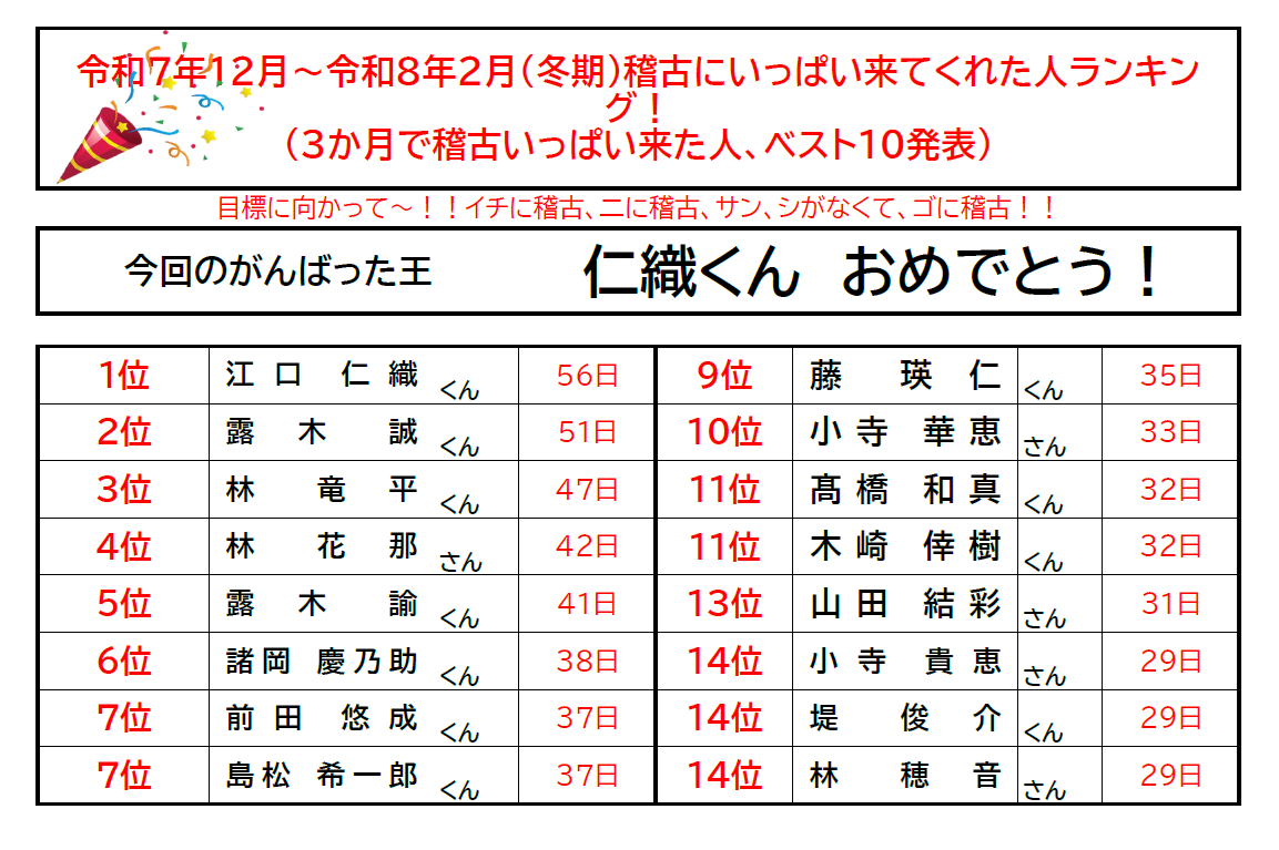 令和7年度空手稽古出席日数【冬期】