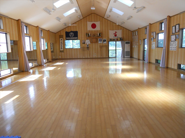 天窓からは日が入り、とても明るく開放感がある道場です。冷暖房も完備しておりますので、熱中症対策もバッチリです。ここで、毎日道場生が稽古に励んでいます。