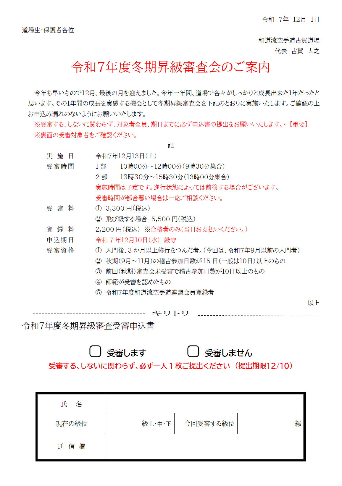 令和7年度冬期昇級審査会案内申込書