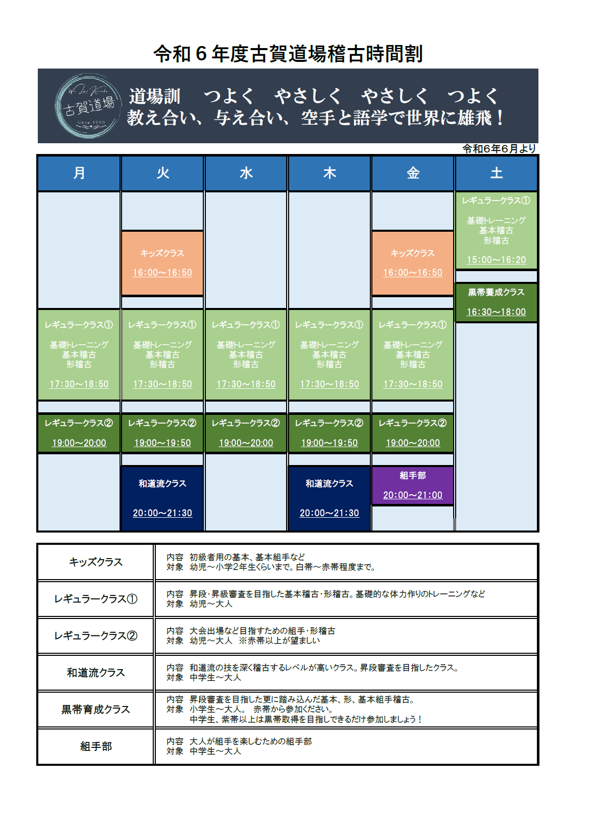 令和6年度古賀空手道場稽古時間割(2024.6版)